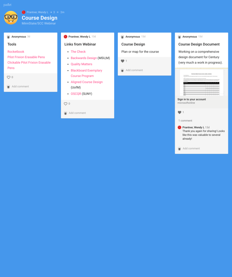 I facilitated a professional development course titled “Design Your Courses for Student Learning”. Having participated on the development team for the course, and later leading it, I naturally had some ideas for revisions based on student and colleague feedback. During the course, I led a live online session and had students and others in attendance (the session was open to anyone, not just students in the course) share resources. These are a portion of what I am working on updating.